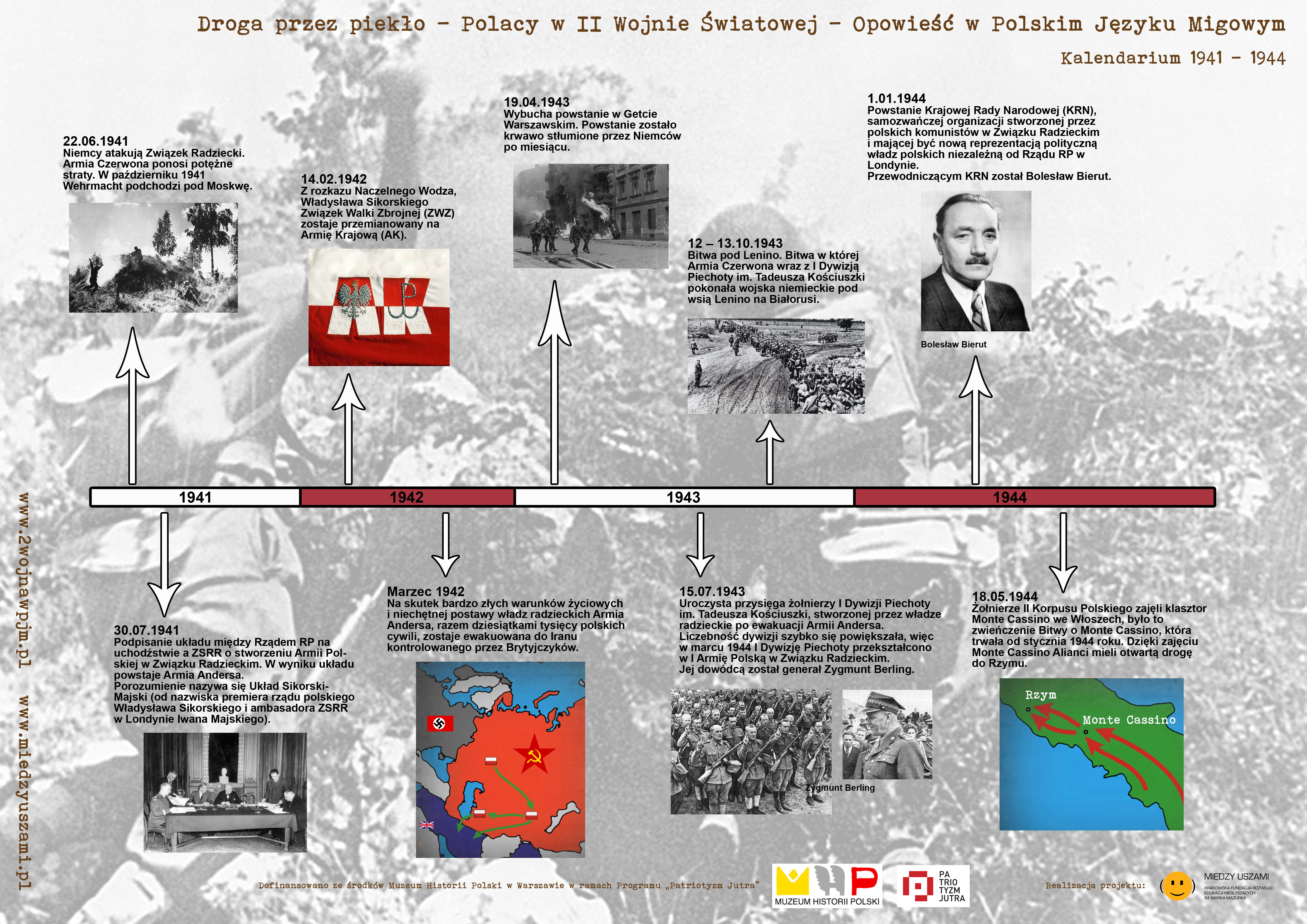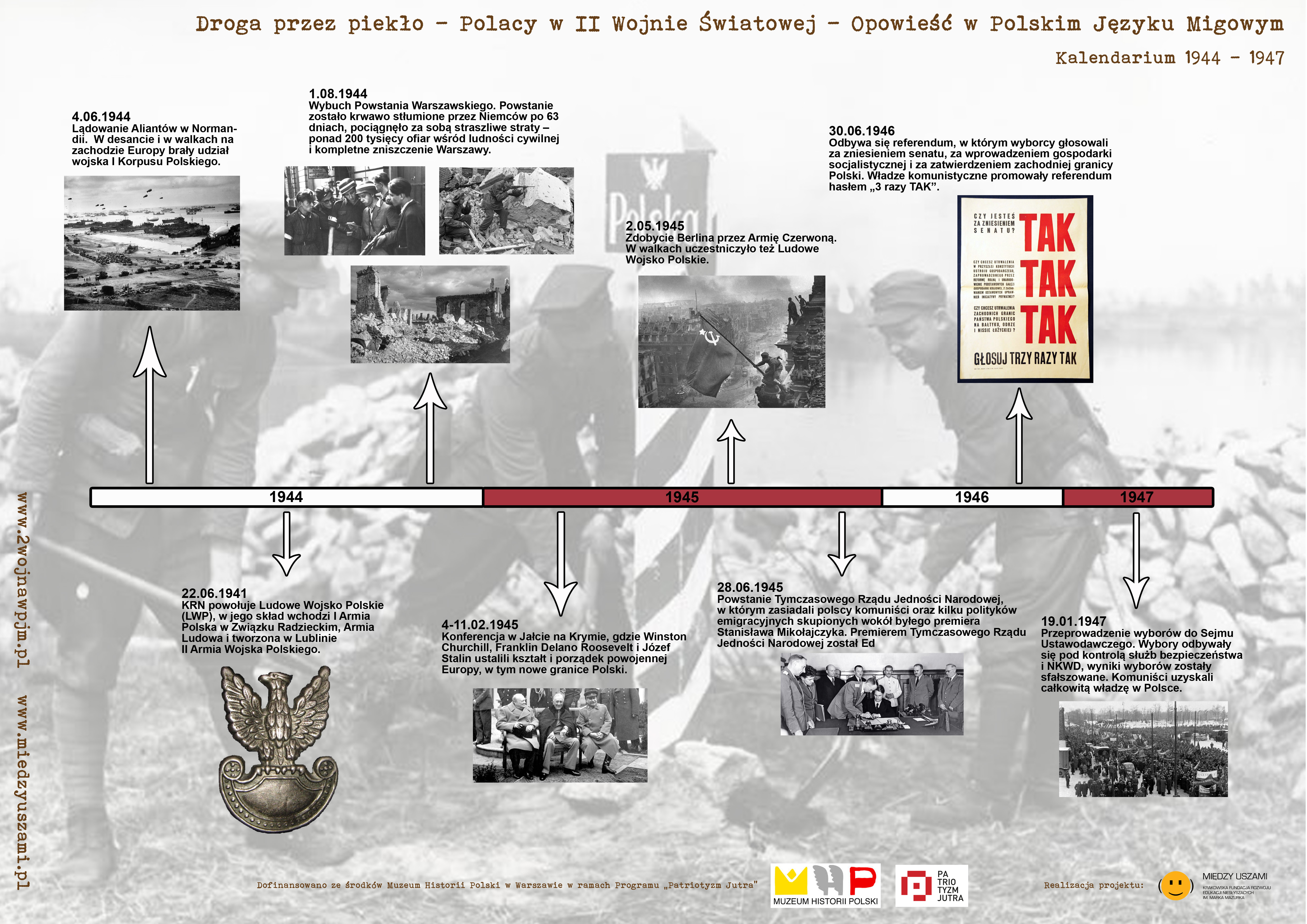 Projekt „Droga przez piekło – Polacy w II Wojnie Światowej, opowieść w Polskim Języku Migowym” jest dedykowany osobom niesłyszącym i wszystkim, którzy uczą się, pracują lub interesują się Polskim Językiem Migowym (PJM). Z pomocą lektora PJM oraz map, zdjęć, infografik przekazywana jest wiedza w kanale komunikacji najbardziej zrozumiałym dla osób niesłyszących. Jednocześnie w dole ekranu jest możliwość włączenia napisów w języku polskim. Jest to zgodne z ideą dwujęzyczności (język polski – Polski Język Migowy) stosowaną przez Fundację Miedzy Uszami we wszystkich swoich projektach.